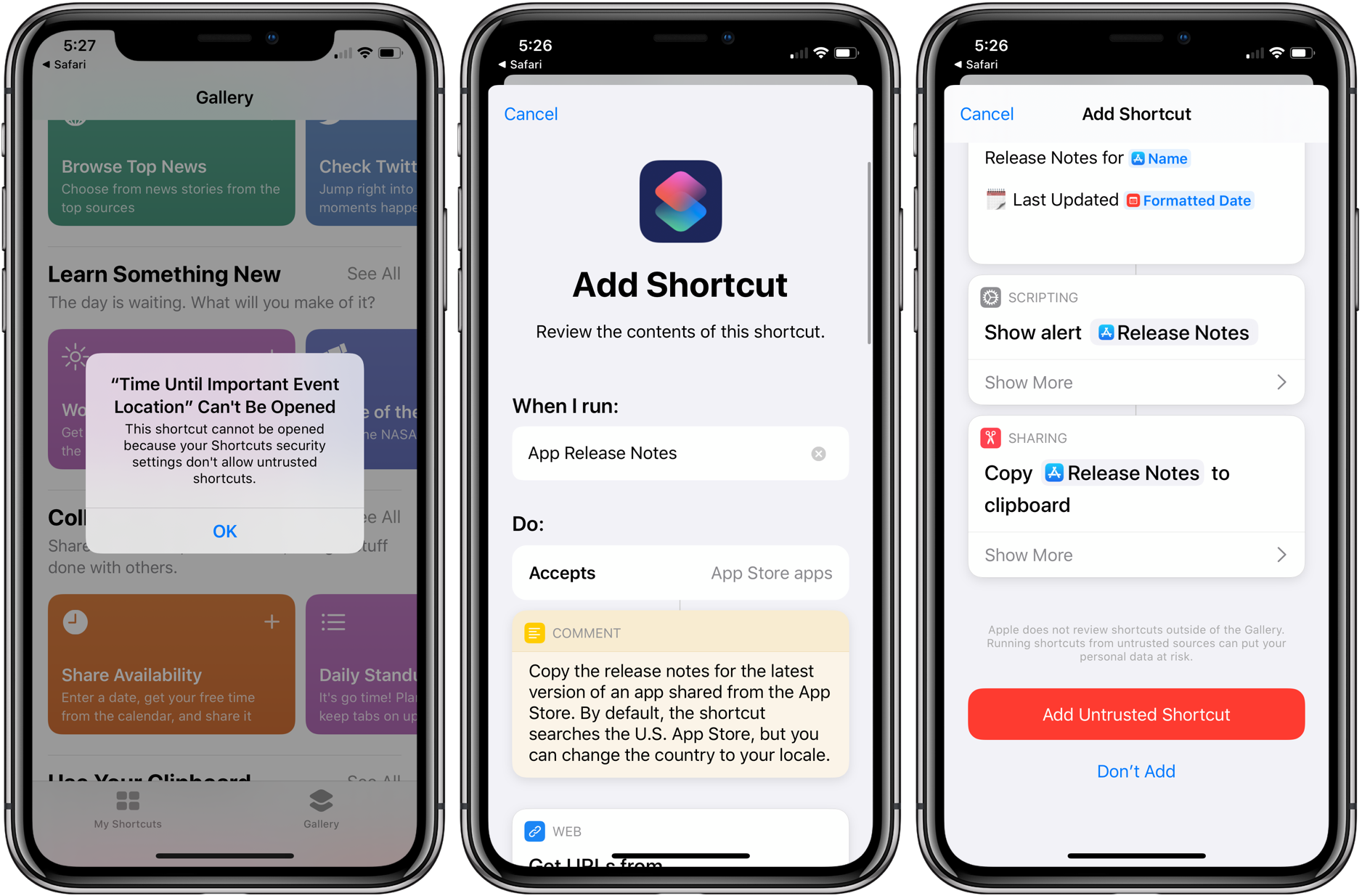 现在可以安装任意快捷指令,不过苹果仍将以红色标记这些「不受信任的快捷指令」。