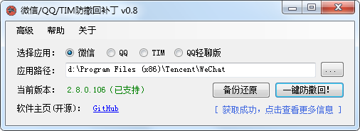 注意:一定要先打开软件点击防撤回之后再打开微信/QQ。另外,软件不会显示哪条消息被撤回,而是对方撤回消息自己这边什么也感知不到。效果如下: